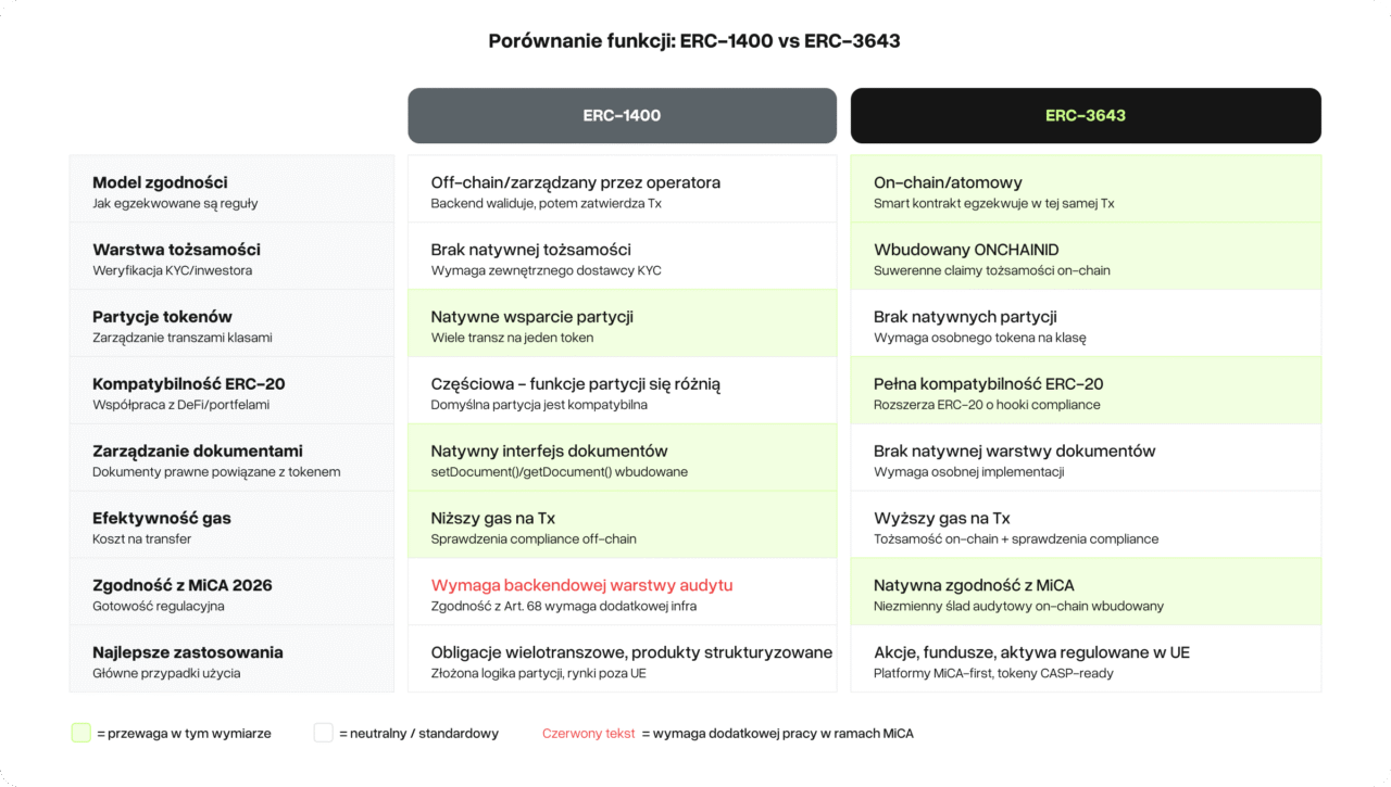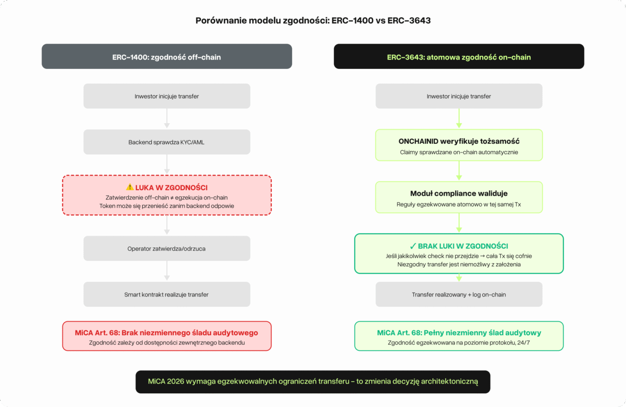 Przed MiCA wybór między ERC-1400 a ERC-3643 był głównie kwestią preferencji. Oba działały. Oba mogły być compliant. Logika compliance i tak żyła po stronie backendu, a regulatorzy nie zdefiniowali jeszcze, co w praktyce oznacza „udowodnione egzekwowanie”.