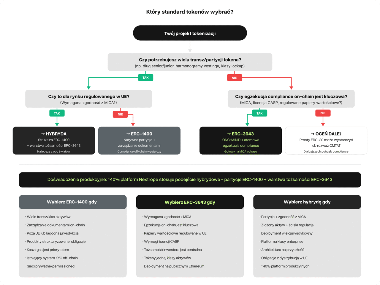 Tokeny opracowali ERC-3643 i używają go wyłącznie. Securitize pierwotnie wspierali ERC-1400, ale przeszli na DS Protocol. Polymath przeszedł na Polymesh (osobny chain). W praktyce wybór dotyczy mniej standardu konkretnego vendora, a bardziej modelu compliance pasującego do Twojego środowiska regulacyjnego.