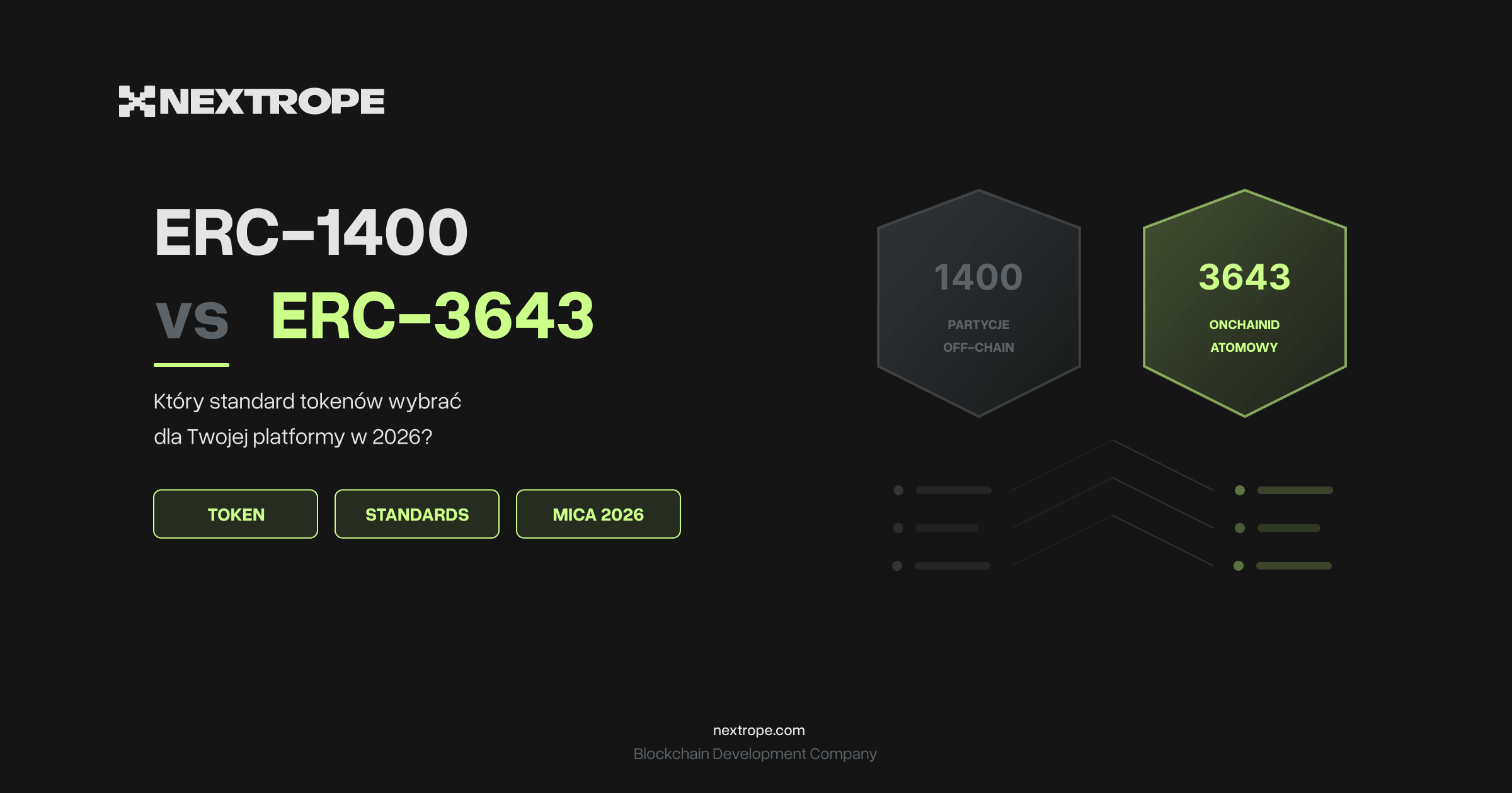 Ten przewodnik opisuje ERC-1400 i ERC-3643 z perspektywy buildera – co każdy standard faktycznie robi na poziomie kontraktu, gdzie się pokrywają i jak wymogi MiCA wpływają na wybór każdego z nich. Oparty na platformach, które dostarczyliśmy dla instytucjonalnych emitentów w Europie, Kanadzie i Nowej Zelandii.