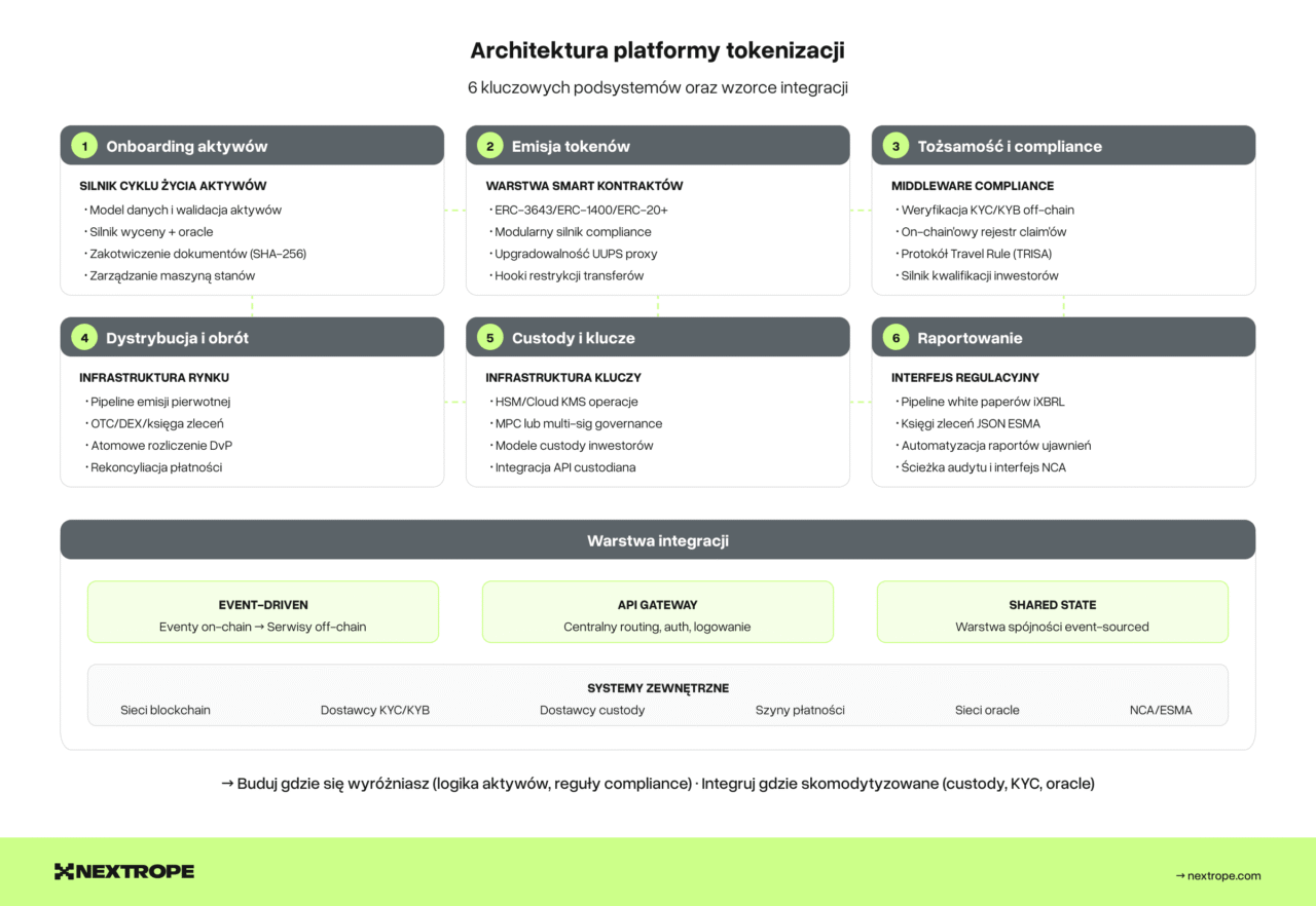 Produkcyjna platforma tokenizacyjna to nie pojedyncza aplikacja. To skoordynowany system sześciu podsystemów, z których każdy ma własny model danych, tryby awarii i charakterystyki skalowania: