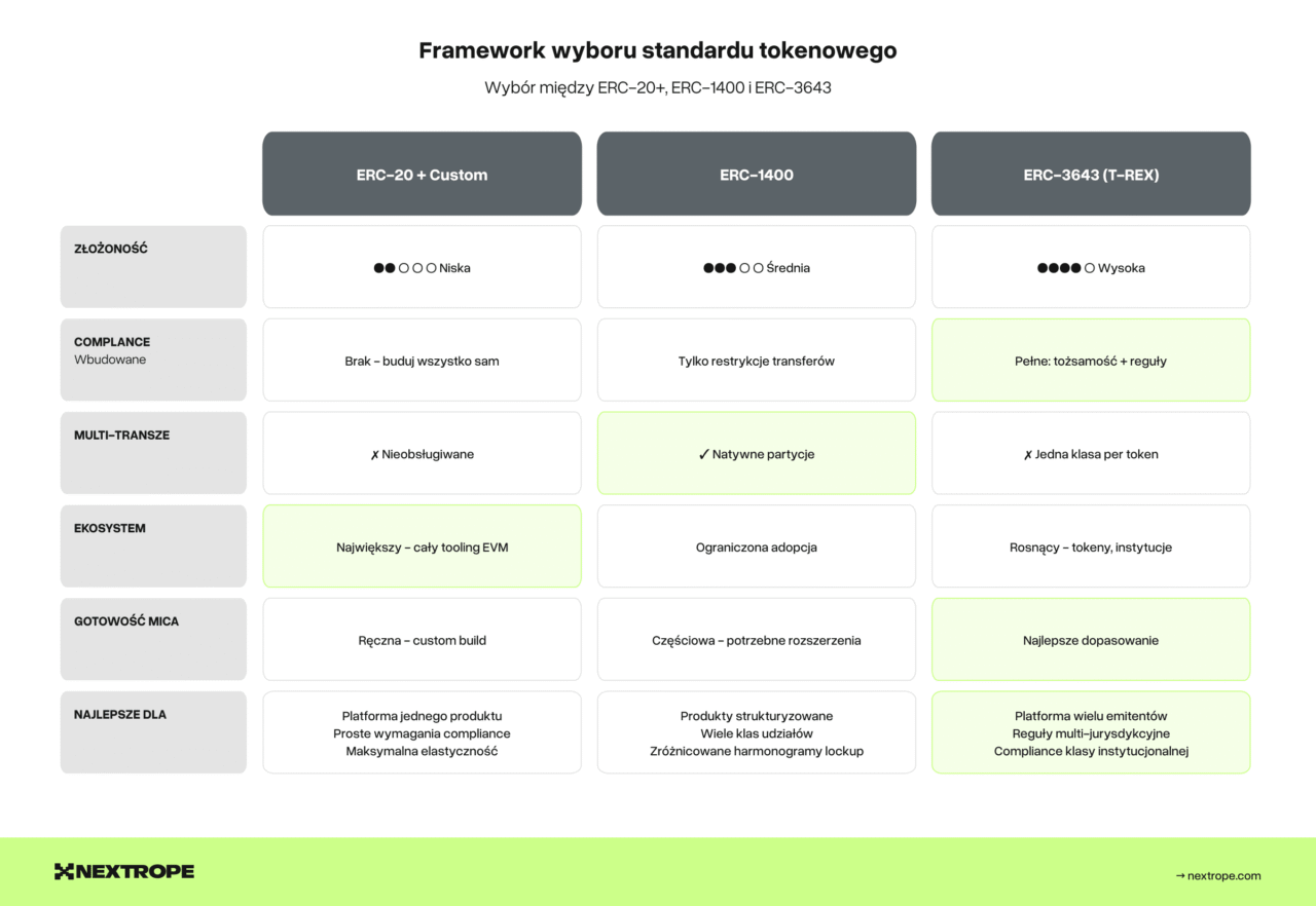 ERC-20 z custom’owymi rozszerzeniami – najprostsze podejście. Bierzesz bazowy standard fungible token i dodajesz hooki restrykcji transferów. Plusy: maksymalna elastyczność. Minusy: musisz sam zbudować całą logikę compliance.