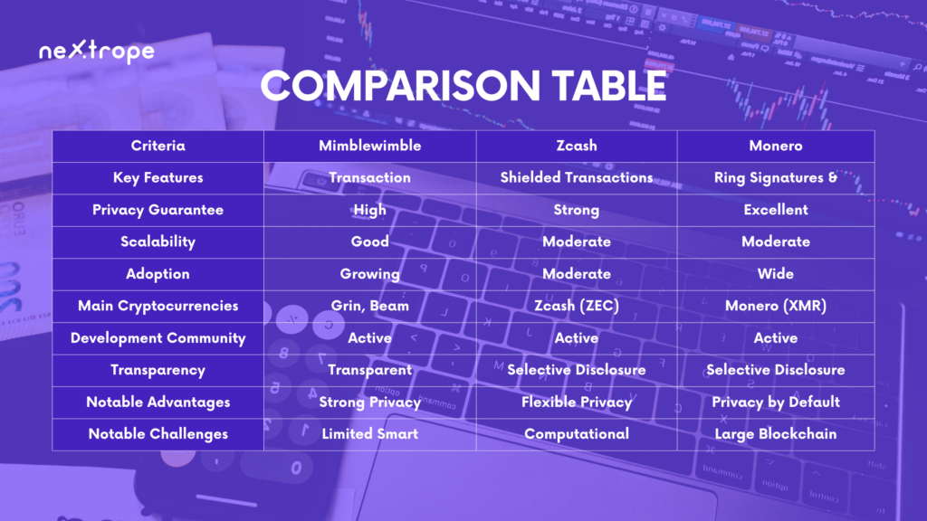 To sum up, addressing privacy concerns related to cryptocurrencies is made possible through privacy-enhancing technologies like Mimblewimble, Zcash, and Monero. These technologies implement unique approaches to preserve user privacy and bolster transaction security. By focusing on transaction aggregation in Mimblewimble, employing zk-SNARKs for shielded transactions in Zcash, and utilizing ring signatures alongside stealth addresses in Monero, individuals and businesses can comprehend these technologies and make educated decisions to safeguard their sensitive data while interacting with cryptocurrencies.