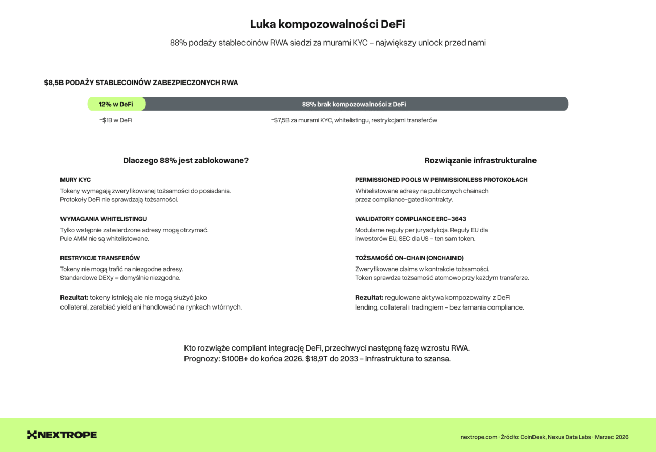 Tylko 12% z ~8,5 mld USD podaży stablecoinów zabezpieczonych RWA jest wykorzystywane w protokołach DeFi. Pozostałe 88% pozostaje zamknięte za barierami KYC, whitelist i ograniczeń transferów, które uniemożliwiają kompozycyjność. To jednocześnie największy problem i największa szansa w tokenizacji RWA.