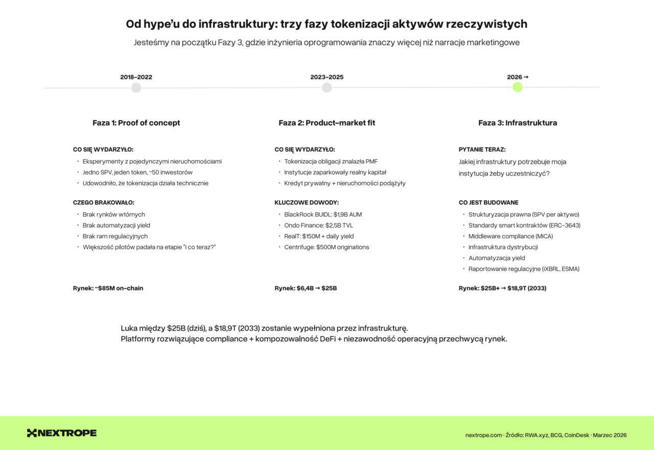 Eksperymenty z pojedynczymi nieruchomościami. Jedno SPV, jeden token, jeden blockchain, około 50 inwestorów. Udowodniono, że tokenizacja działa technicznie. Nie udowodniono, że działa operacyjnie. Większość projektów zatrzymywała się na etapie „i co dalej?”. Tokeny istniały, ale brakowało rynku wtórnego, automatyzacji dystrybucji yield ani ram regulacyjnych.
