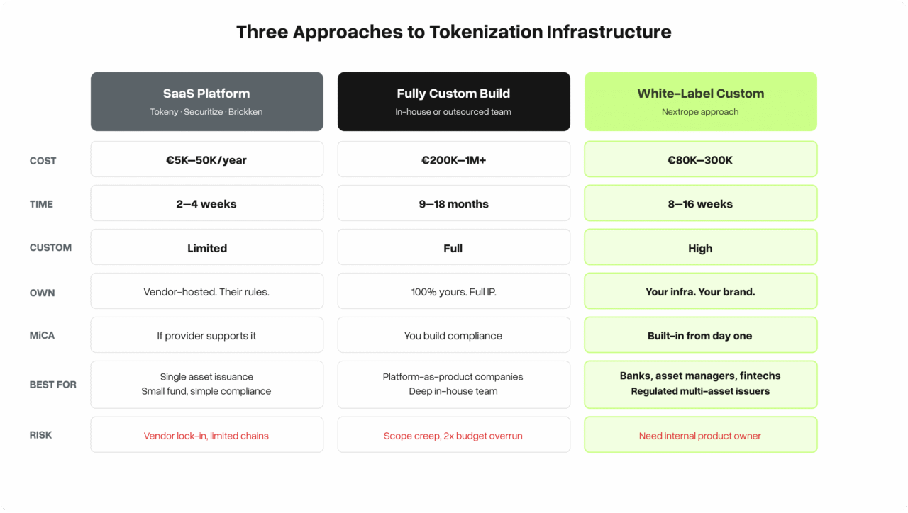 For everything in between: regulated issuers, asset managers tokenizing multiple products, banks adding digital asset capabilities, fintechs building tokenization into their stack – white-label custom is typically the right combination of speed, control, and cost.