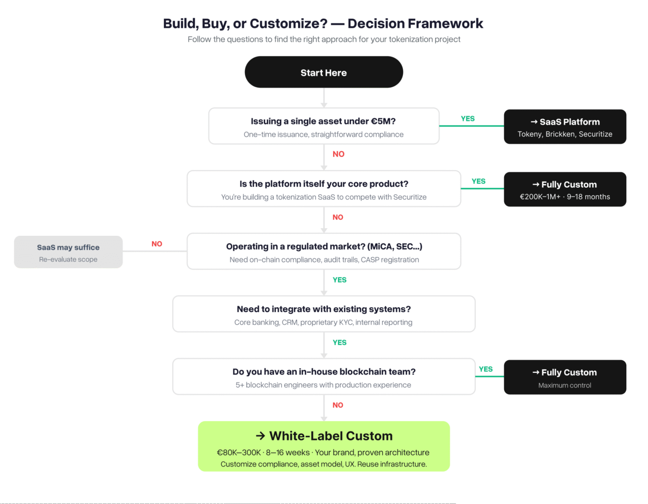 The flowchart above captures the critical questions we walk through with every client in the first discovery call. Most regulated issuers: banks, asset managers, fintechs adding digital assets to their stack land in the white-label custom zone. But there are legitimate cases for each approach, and we’ll tell you if SaaS or fully custom makes more sense for your situation.